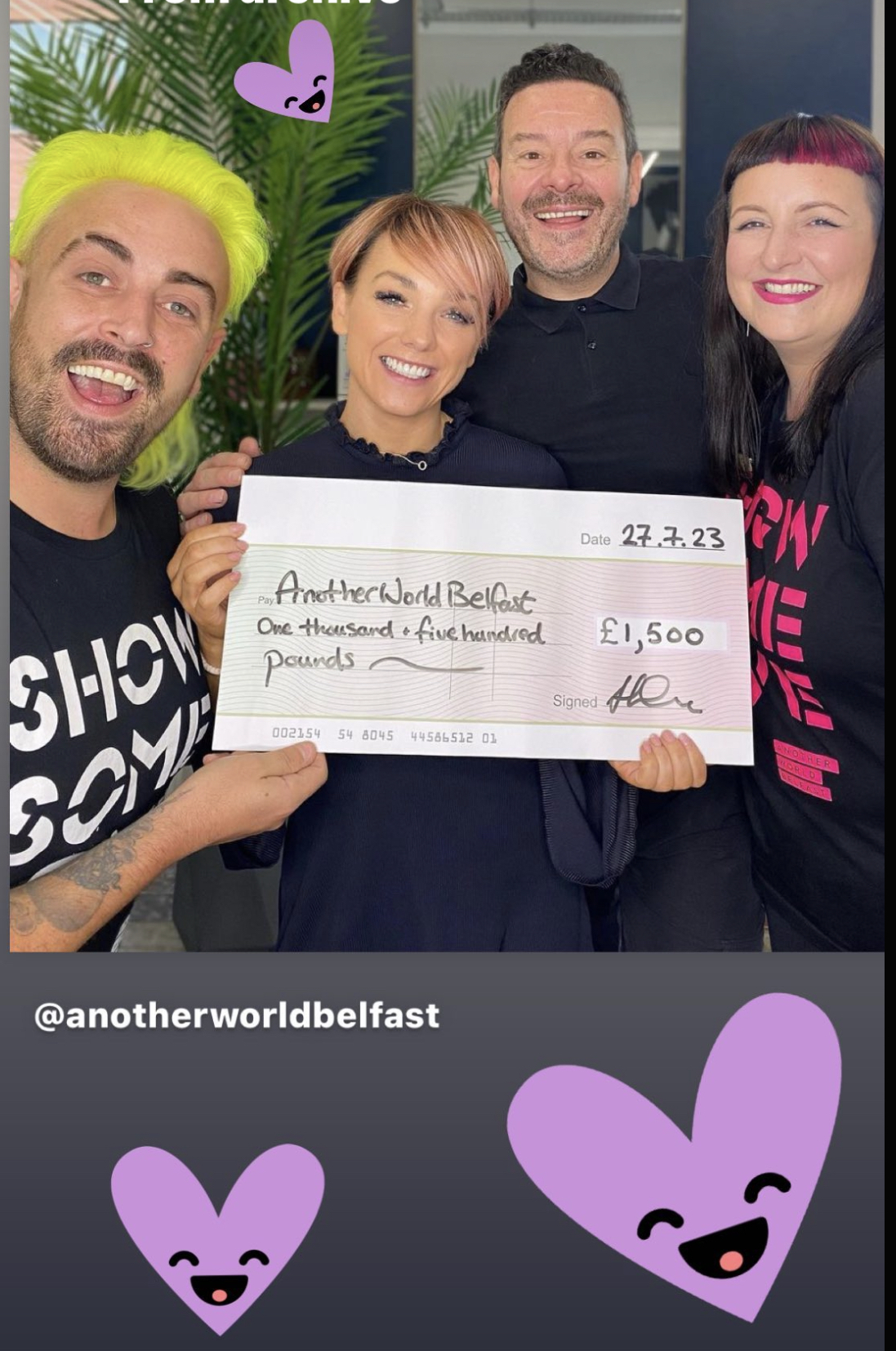 Our goal was to raise [ through in-salon education] much needed funds for Another World Belfast Charity and it was our pleasure to hand over £1500 to Connor and Becky. Another World Belfast is a fabulous Charity offering help and hope to refugees coming to Northern Ireland. We also hope that more will be raised by September to help them carry out their beautiful work.